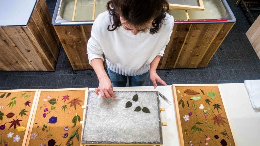 Experts take mush and magically make it transform into paper. From the pulp of Kozo mulberry trees, a transparent liquid solidifies in layers to reveal a template for design. Strengthened from the tree fibres the paper is more durable and substantial. Winter is traditionally a time to make washi with frozen water free from impurities. Add fallen leaves or seasonal flowers to enliven the plain sheet of Washi. As it dries it becomes a real piece of thick paper, ready to be stamped and painted with words of wisdom, then displayed on walls in lands near and far.