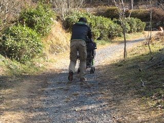 The paths started off a bit bumpy which we thought may be the worst we might find. But after about 2km through hills and gravel we came to a cobbled stair way that seemed to go up for quite a distance. So, instead of carting the buggy up, we decided to take the road instead, which was the right decision although we missed the scenery we ended up at the same exit from the forest. This happened a few times before Masaki finally said for me to go along the real route as there was no point in both of us missing the action inside the hills.