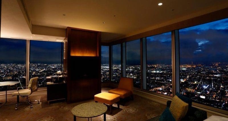 The floor to ceiling glass windows offer incredible views of sunsets over Osaka bay.