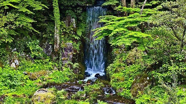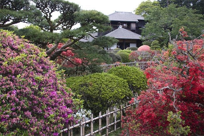 The garden is surrounded by a water filled moat, it incorporates a pond internally and features a man-made stream that flows for 650m through the garden. Yuishinzan Hill offers stunning views of plants like azaleas and rhododendrons and seasonal red and white flowers.