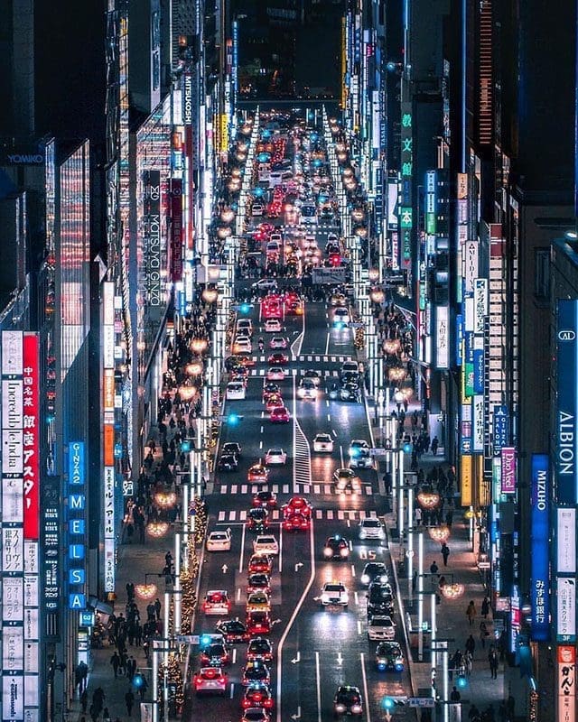 Stores of note include Prada, Ferragamo, Cartier, Chanel, Gucci, Bvlgari Louis Vuitton. Hermes, Tiffany & Co., Armani, and Issey Miyake, among others. The street scene is particularly vivid and beautiful after dark but when the stores are still open due to the endless neon signs that stretch up the side of each building.